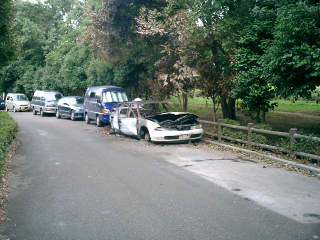 ということで、ワタシは先に失礼します。公園出口の道には廃車の列 |
