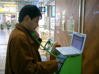 ケータイの電池が切れたので、パソコンを公衆電話の上に置いて・・おバカ |