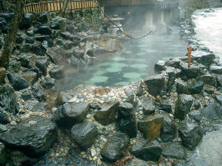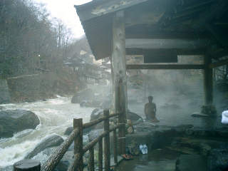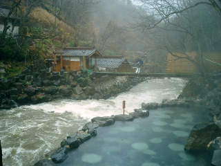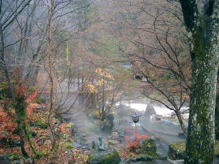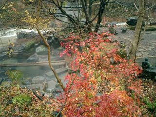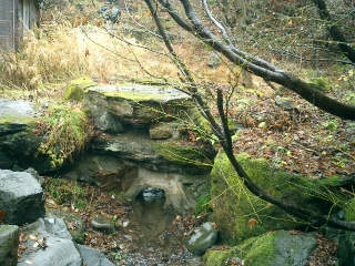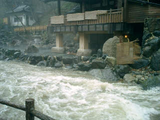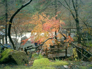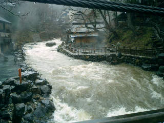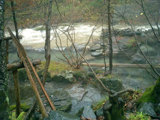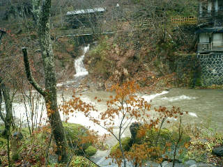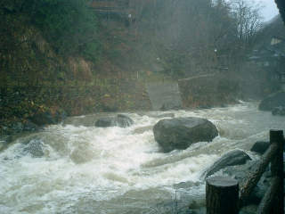 渓流の時は風情があるのでしょうが、あいにくの雨で増水し、激流に |